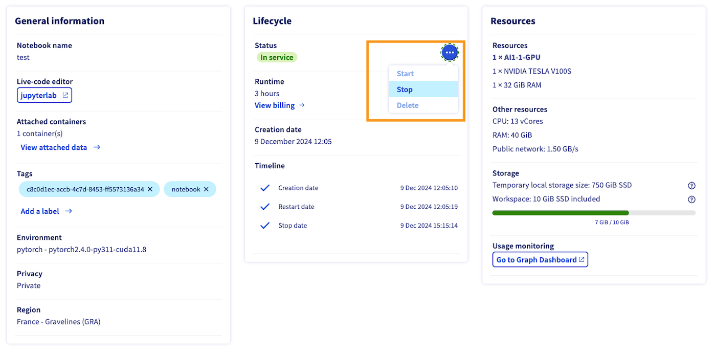You can stop your AI Notebook at any time. This will release its compute resources but will keep your Notebook data and installed libraries. Therefore, you will not incur any further charges for compute unless you restart the Notebook. However, attached storage will be billed at the price of OVHcloud Object Storage. Consult the AI Notebooks Billing documentation for more information.