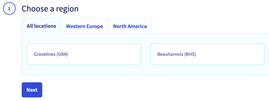 Each job is executed in an OVHcloud region. Each region has its own AI Training cluster with potentially varying capabilities. For more information see the capabilities. Select the desired region and click Next.