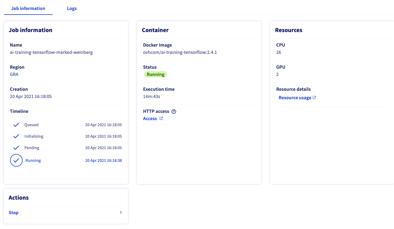 • Container: describes the status of your job and provides you with the URL to access any service exposed by your job on the port 8080. The URL is of the form https://<JOB-ID>.job.<REGION>.ai.cloud.ovh.net/. If the service is not exposed on the port 8080 it is still accessible by specifying the port in the URL this way: https://<JOB-ID>-<PORT>.job.<REGION>.ai.cloud.ovh.net/. You can check the list of available ports in the capabilities.