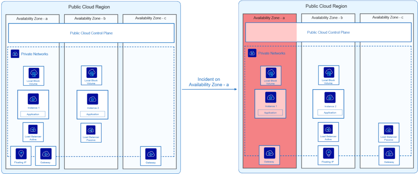When AZ-a is restored, the Control Plane gradually reintegrates the resources and instances concerned into the overall infrastructure. For zonal services (e.g. instances, High Speed Block), if data has been lost, recovery depends on the implementation of a backup strategy. In the absence of backup, some recent data may remain irrecoverable, except for services such as Block Storage Classic Multi-Zone or Object Storage, which have built-in resilience mechanisms.