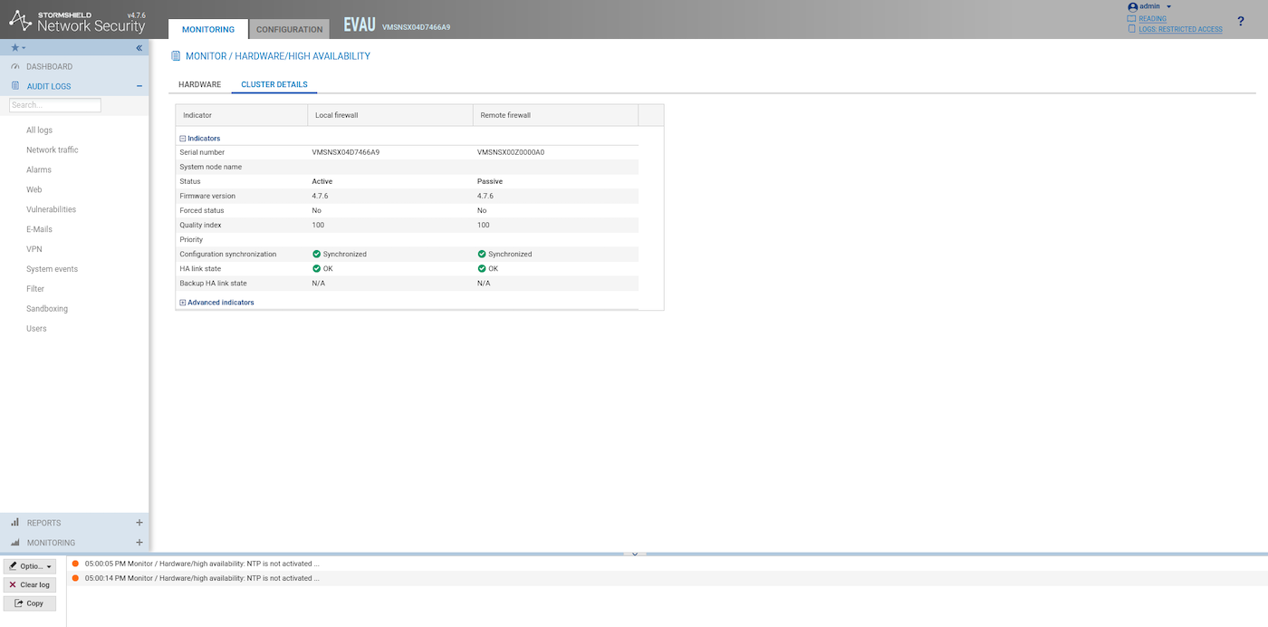 Para este exemplo, utilizamos a solução em linha de comandos SSH. Se preferir utilizar a interface gráfica do utilizador para a sincronização, consulte a secção « Ecrã de Alta Disponibilidade » da documentação do Stormshield SNS EVA para obter informações detalhadas sobre os passos a utilizar.
