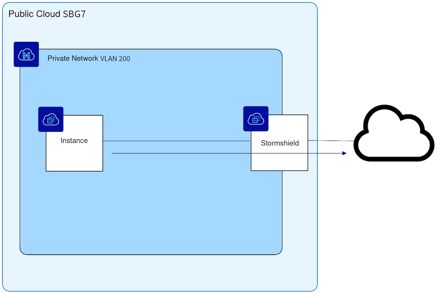 Neste exemplo, a firewall virtual funcionará como um gateway seguro para as instâncias privadas (ou qualquer outro servidor) no seio do VLAN200 da rede vRack específica. Este tipo de tráfego pode ser filtrado através de URLs na firewall.
