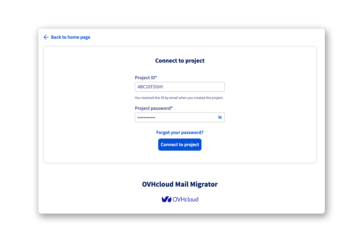 OVHcloud Account ID(consoante o tipo): Este campo é automaticamente preenchido quando está ligado a uma conta OVHcloud. Para mais informações, consulte a secção "Migrar via conexão à conta cliente OVHcloud".