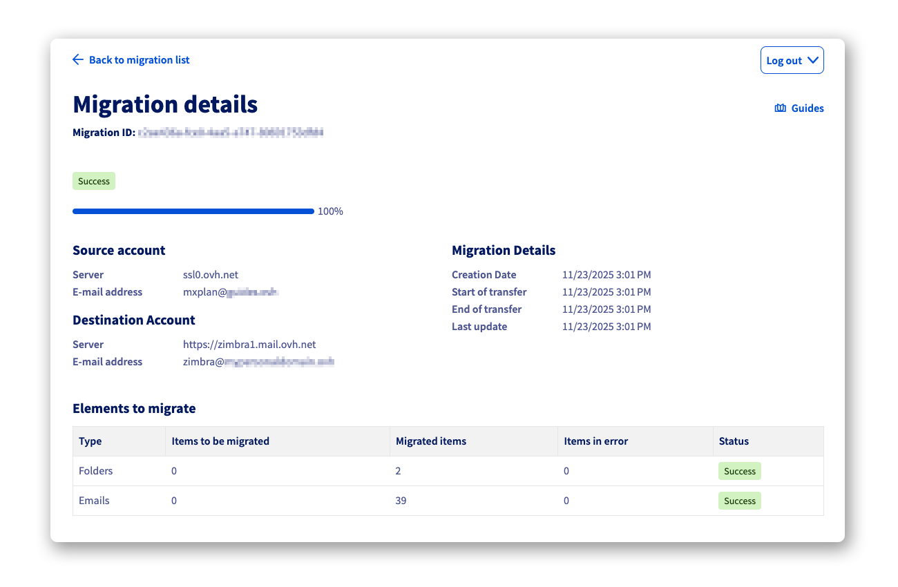 OVHcloud Mail Migrator é uma ferramenta criada pela OVHcloud que responde à necessidade de reversibilidade. Permite migrar as suas contas de e-mail para os seus endereços de e-mail da OVHcloud ou para um serviço de e-mail externo. O processo suporta diferentes tipos de conteúdos, tais como e-mails, contactos, calendários e tarefas, desde que estes sejam compatíveis com os seus endereços de e-mail.
