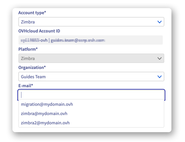 Durante uma migração para ou a partir de uma conta OVHcloud, é possível selecionar uma das nossas ofertas MX plan, E-mail Pro, Exchange ou Zimbra.