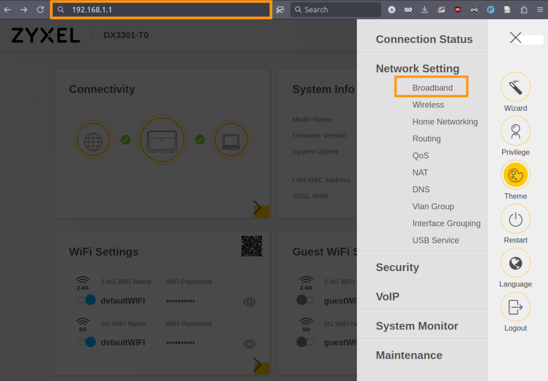 Positionnez-vous ensuite sur le menu Network Setting, puis cliquez sur Broadband.