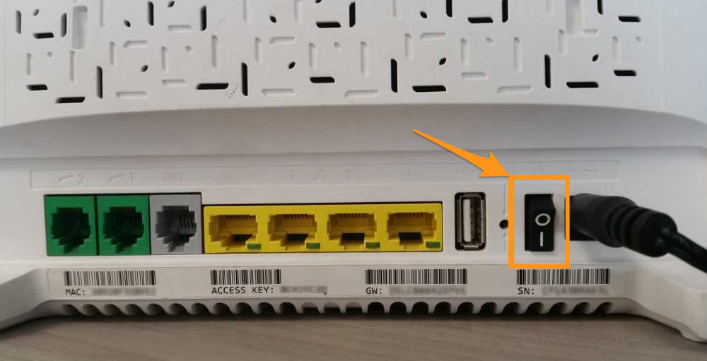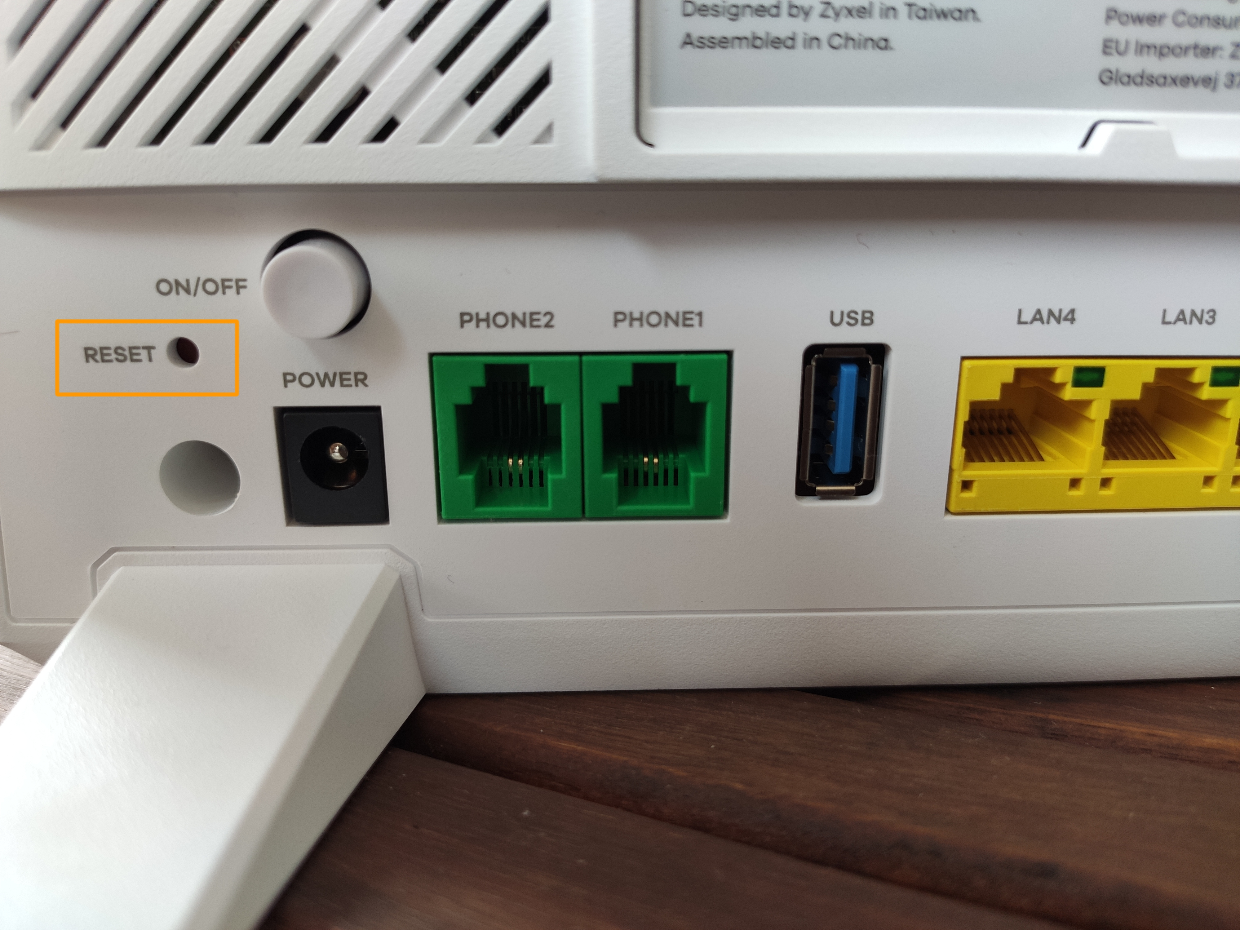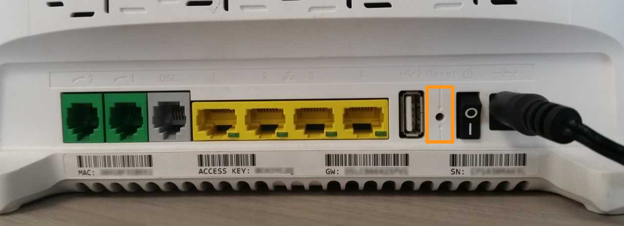 Débranchez tous les câbles de type RJ45 (les ports jaunes sur la photo ci-dessous). Puis appuyez dans le trou reset (à l'aide d'un objet pointu) pendant au moins 10 secondes. Attendez alors, tout en maintenant ce bouton, que le voyant Power commence à clignoter. Dès que cela sera le cas, vous pourrez relâcher.