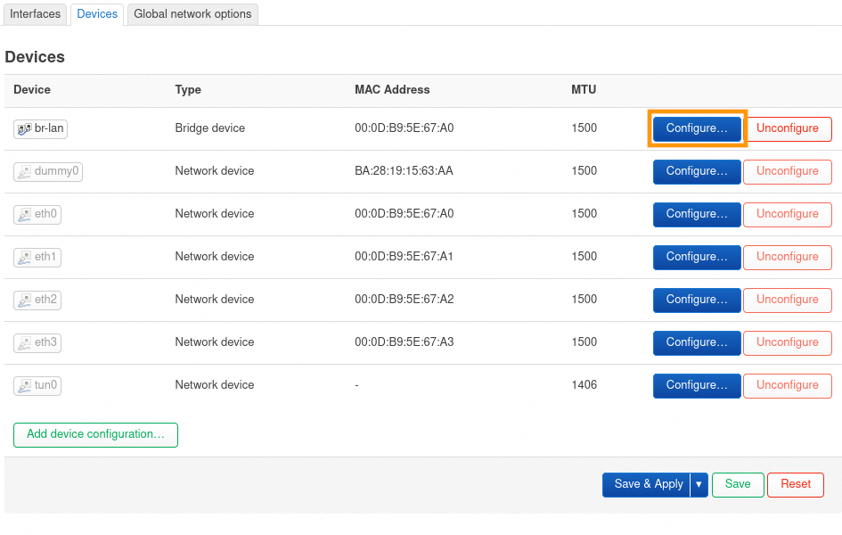 Modifiez le bridge br-lan à l'aide du bouton Configure....