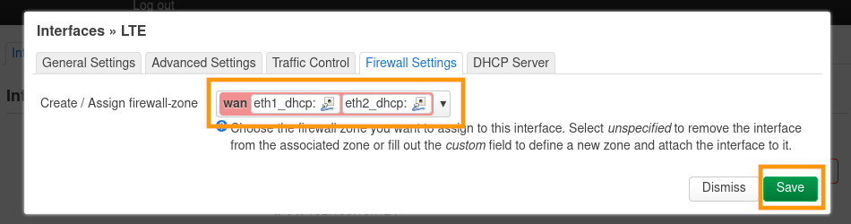Dans le paramètre Create / Assign firewall-zone, choisissez la zone wan en rouge.