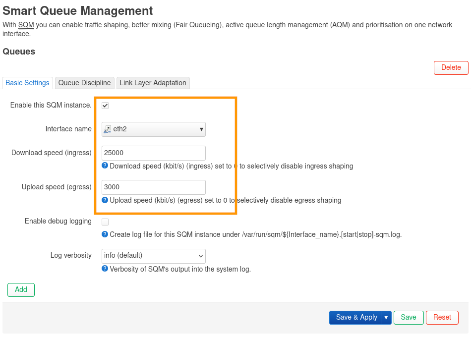 SQM est gourmand en ressources processeur, il n'est pas recommandé de l'activer sur des liens avec des débits supérieurs à 300Mbps, par exemple sur une connexion fibre.