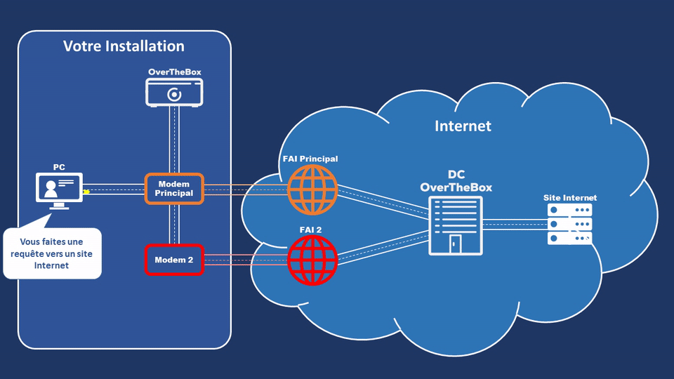 Lorsque votre ordinateur, branché sur le modem principal, effectue une requête sur Internet, cette dernière transite d'abord par l'OverTheBox qui va ensuite transférer les paquets intelligemment vers les deux connexions Internet grâce aux ports Ethernet du modem principal, comme le montre l'illustration suivante :