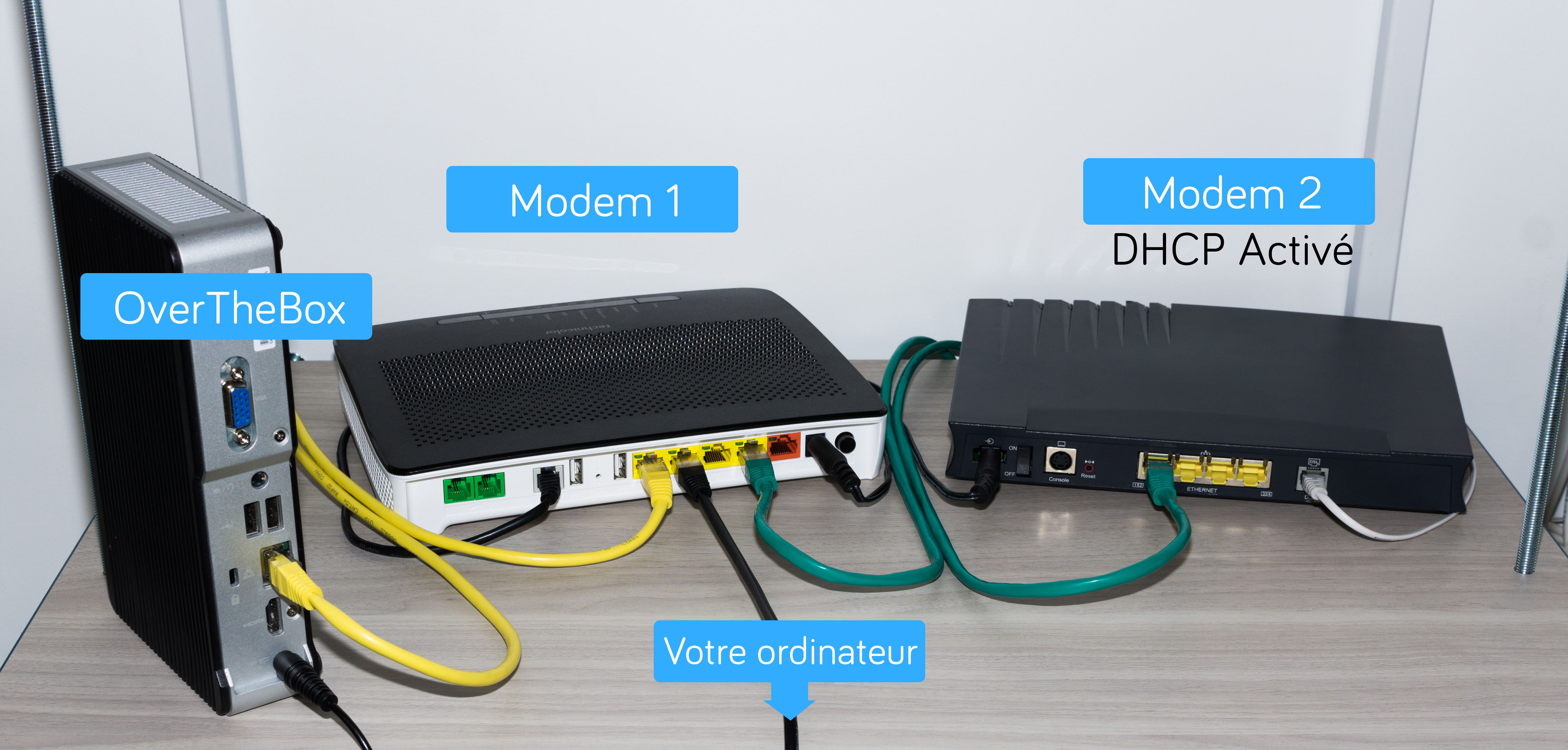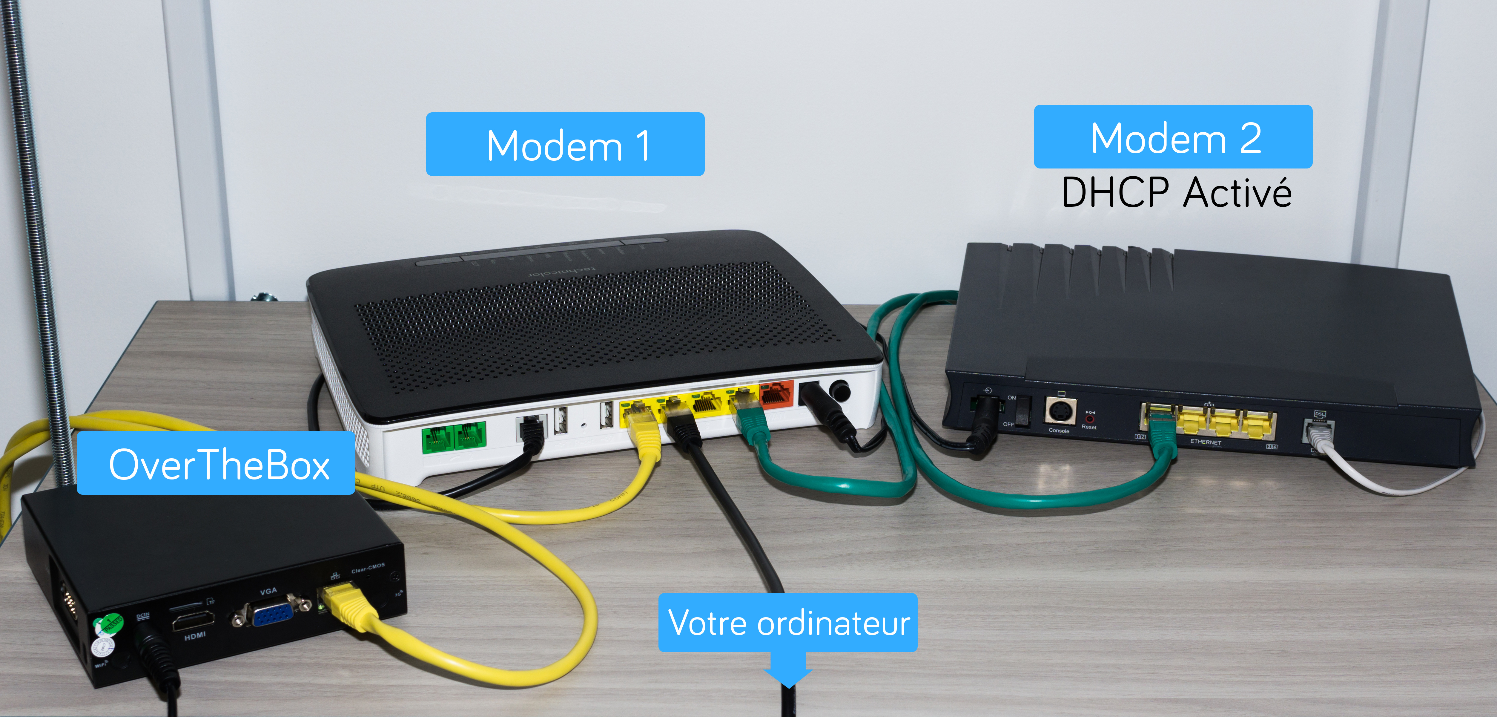 Les opérations qui suivent doivent être effectuées depuis un ordinateur connecté directement sur le modem principal afin que votre OverTheBox soit reconnue (câble noir sur l'image ci-dessous).
