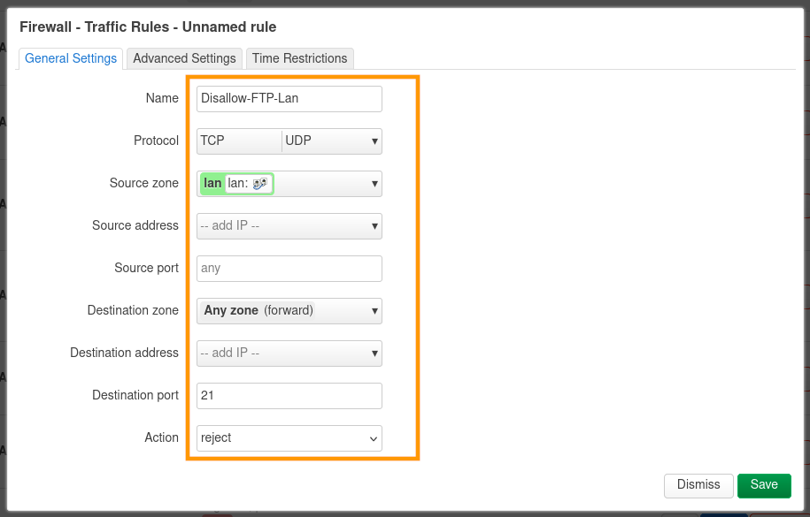Modifiez le paramètre Name pour donner un nom à la règle. Pour notre exemple, la règle se nomme Disallow-FTP-Lan.