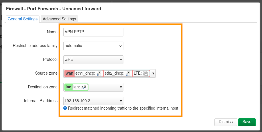 Modifiez le paramètre Name pour donner un nom à la redirection. Pour notre exemple, la règle se nomme VPN PPTP.