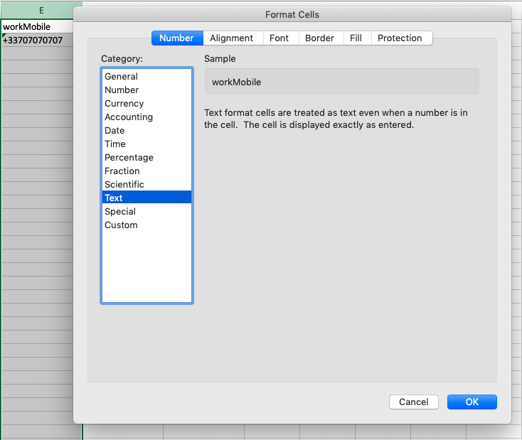 The vast majority of spreadsheet tools will not take into account the international format expected for telephone/fax numbers (+44xxxxxxxxxx). This means you will need to change the format of the cells that contain these numbers (workPhone, workMobile, etc.). To do this, select the columns concerned, and select a "Text" format for them.