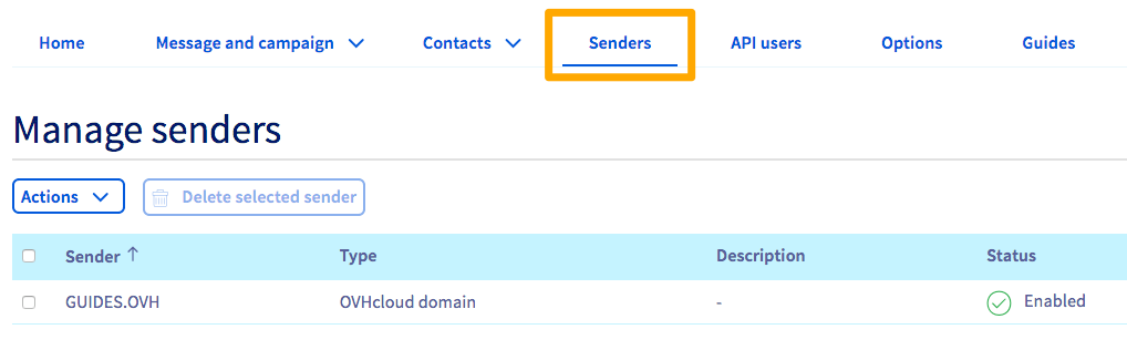 By default, SMS messages from an OVHcloud account in France are sent from a short number, which enables recipients to reply back. You may want to create an alpha-numeric sender name via the Senders tab, so that your SMS messages are sent with your company or organisation's name.