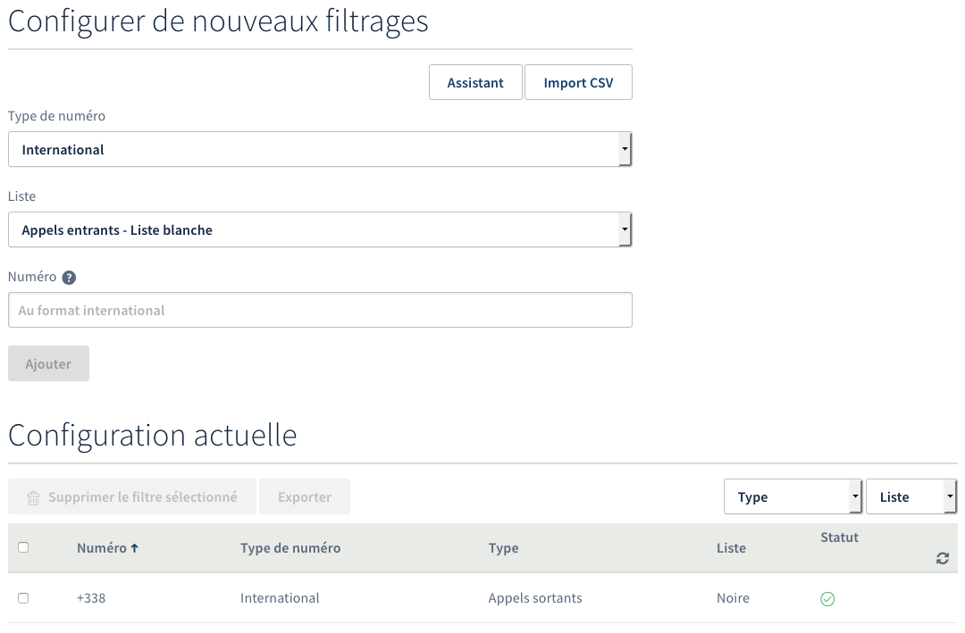 Si vous avez décidé d'activer un filtrage d'appels entrants et/ou sortants, vous devez à présent configurer de nouveaux filtrages dans la ou les listes que vous avez sélectionnées.