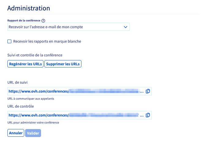 - Regénérer les URL : permet de remplacer les URL existantes par d'autres ; - Supprimer les URL : permet de désactiver le suivi et le contrôle de la conférence.