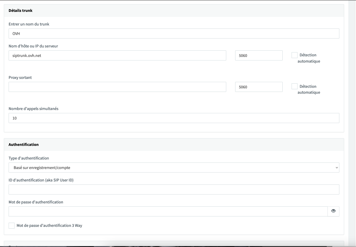 Mot de passe d'authentification : Renseignez le mot de passe SIP de votre trunk.