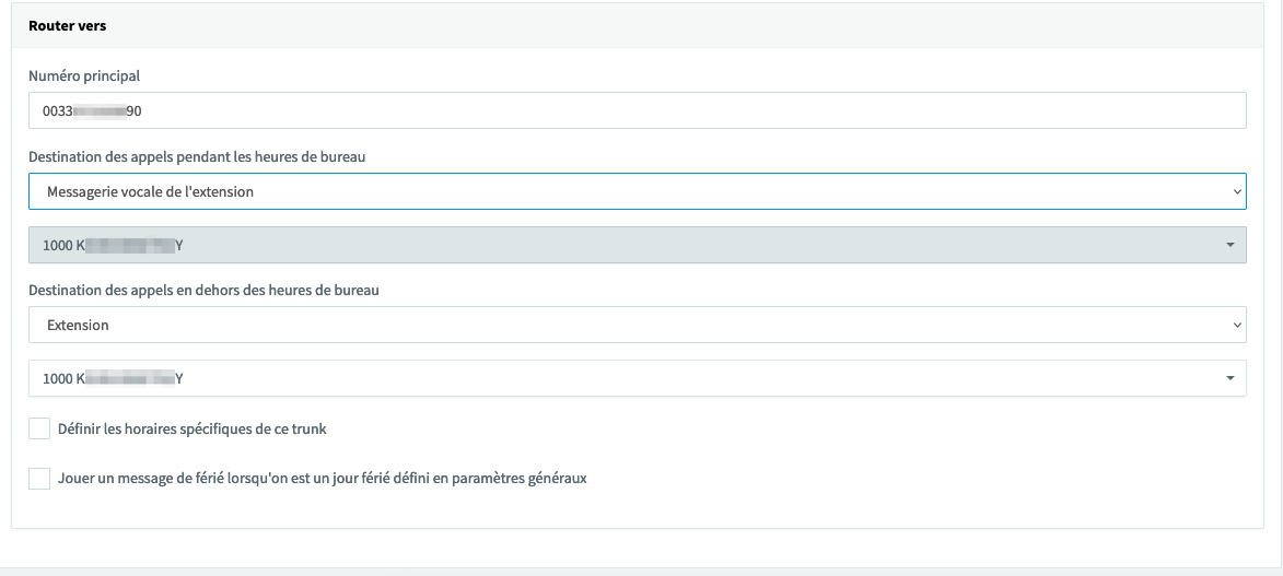 Dans le champ Numéro principal, entrez le numéro de votre trunk (dans notre exemple : 0033XXXXXXX90).