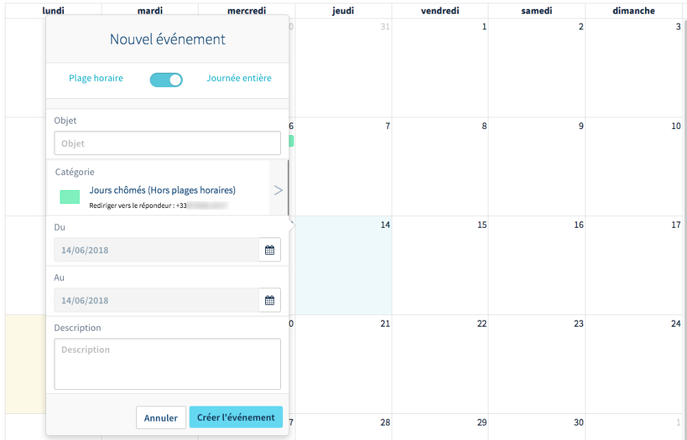 Hors plages horairesEn dehors des plages horaires, les appels sont redirigés automatiquement sur le répondeur de votre ligne. Vous pouvez cependant modifier cette redirection.
