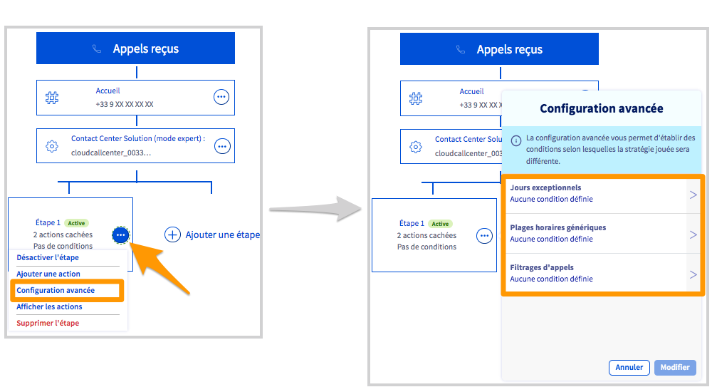 Chaque appel entrant va suivre une ou plusieurs étapes successives que vous allez définir. Au sein de chaque étape, une ou plusieurs actions devront également être créés.