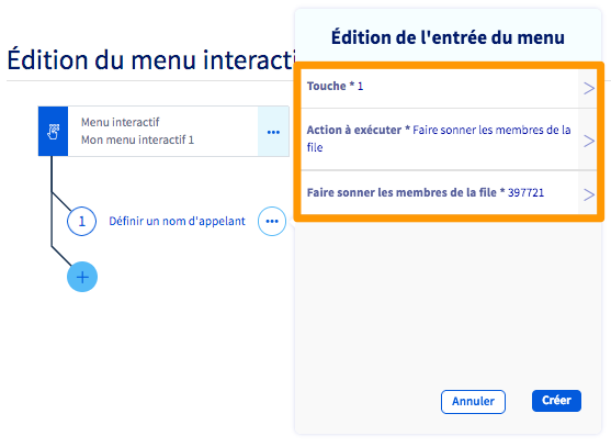 • Une étape 2 dans laquelle une seule action fera sonner une première file d'appels.