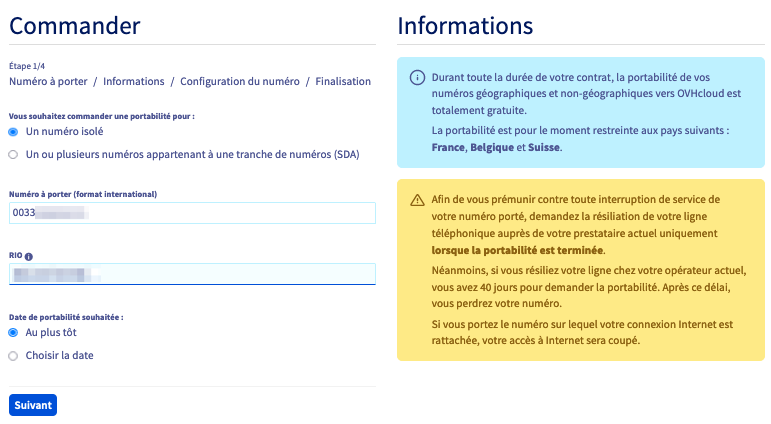 Cochez la case Un numéro isolé et renseignez le numéro isolé que vous souhaitez porter au format international (par exemple, « 0033100000000 » pour un numéro français). Indiquez ensuite le RIO du numéro concerné, sélectionnez la date souhaitée de la portabilité, puis cliquez sur Suivant.
