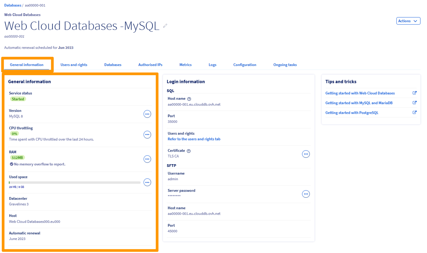 NaÁrea de Cliente OVHcloud, no menu à esquerda, aceda à secção Web Cloud Databases e clique na instância em causa. Certifique-se que está no separador Informações gerais.