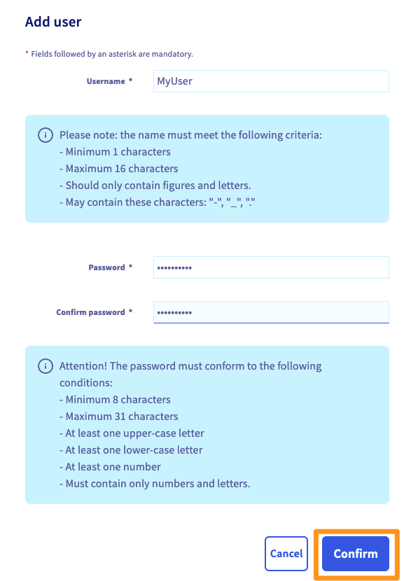 Se o seu projeto não precisa de um utilizador adicional, pode passar à etapa seguinte. Caso contrário, para criar um utilizador na instância Web Cloud Databases, clique no separador Utilizadores e permissões e no botão Adicionar utilizador.